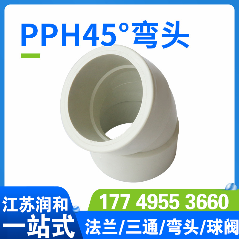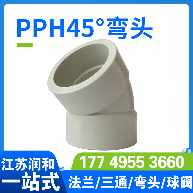 江苏德赢VWIN工程塑业有限公司生产PPH45度弯头-分为热熔焊接 对焊焊接 承插焊接 均聚聚丙烯 主要生产工程化工FRPP管材、PPH管材、PVDF管材防腐管阀件,以及化工喷淋塔、洗涤塔、废气处理等设备。